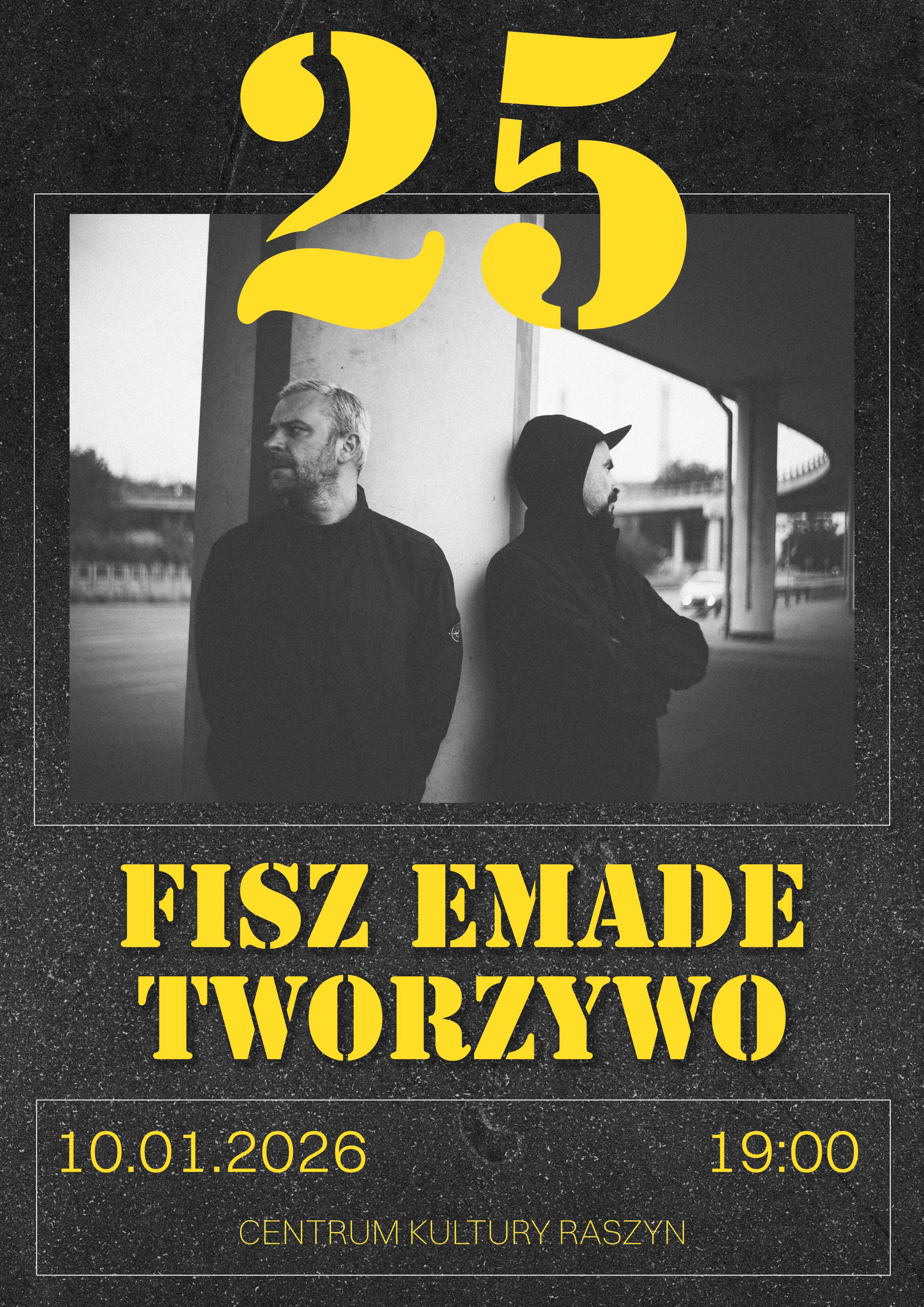 FISZ EMADE TWORZYWO, jeden z najważniejszych zespołów na polskim rynku fonograficznym, powraca z nowym albumem. W nagranym 25 lat od debiutu zespołu - płyty „Polepione Dźwięki”, bracia przyglądają się tym kolorowym, muzycznym latom, w których ugruntował się ich niepowtarzalny i charakterystyczny styl muzyczny. To lata pełne koncertów wraz ze składem. Tworzywo, czasy związane z kulturą hip hop, czasy eksperymentowania i nowego otwarcia po sukcesie płyty „Mamut”. Swoją twórczość po dziś bracia chętnie nazywają „Polepionymi Dźwiękami”, których nie da się zaszufladkować pod jeden gatunek muzyczny. Na płycie „25” w swoim charakterystycznym stylu łączą elektronikę z muzyka rockową, muzyką rap, tworząc przy tym oryginalną fuzję przeróżnych dźwięków i gatunków. ”25” to opowieść o swoich pierwszych zespołach i występach (utwór „Niemoc"), relacji braterskiej "na dobre i na złe" (utwór „Ogień i Woda”). Przez płytę przewija się temat upływającego czasu (utwór „Długie ręce”), pogodzenia się ze swoim wiekiem (utwór „Spływacz” oraz „Śliski pic”), o szanowaniu czasu i docenianiu drobnych gestów i rzeczy (utwory „Dobry dzień”, „Wolno nam”). W związku z rocznicą premiery ich pierwszego albumu, na płycie „25” nie zabraknie również stylistycznych odniesień do debiutanckiej płyty z 2000 roku (utwory „Sedno To jest”, „Śniadanie” oraz „Spływacz”). W nagraniu płyty gościnny udział wzięli Natalia Przybysz, Shachar Elnatan oraz Inbar Elnatan. Sprzedaż biletów rusza 21.11 od godziny 12:00.