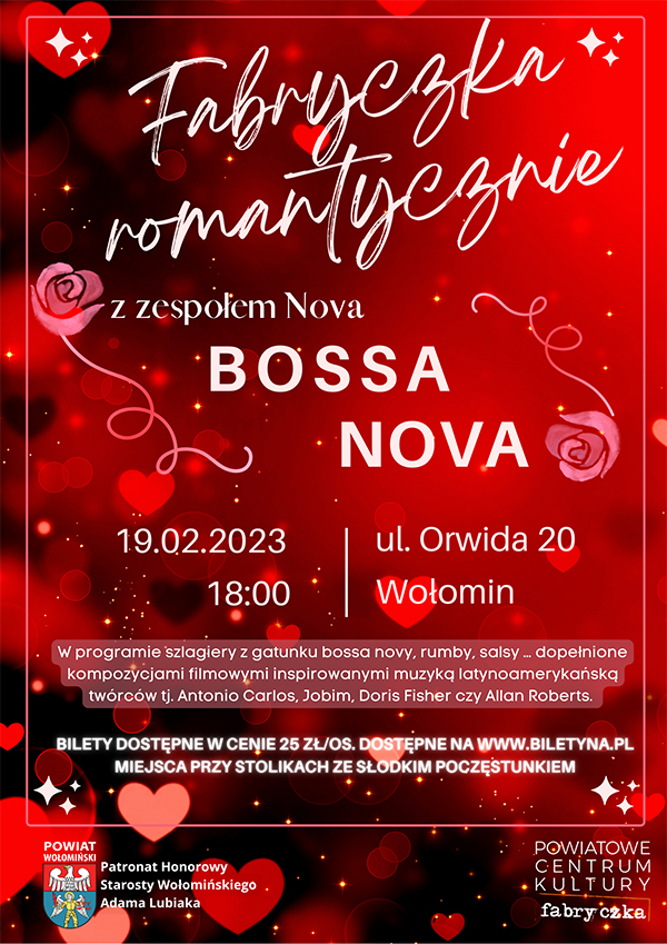 Powiatowe Centrum Kultury Fabryczka w Wołominie zaprasza 19.02.2023 o godzinie 18:00 na wieczór wypełniony utworami Antonio Carlosa Jobima, Dorish Fisher i Allana Robertsa, Seweryna Krajewskiego, a także piosenki z tekstami Jonasza Kofty i Agnieszki Osieckiej.