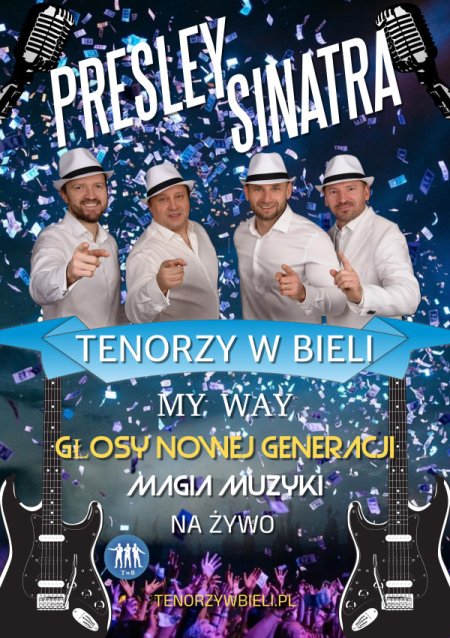 Zespół "Tenorzy w Bieli" to grupa tenorów nowej generacji, tworzących klasyczny przekaz muzyczny w nowej odsłonie. Piękne aranżacje muzyczne dopasowane do współczesnych trendów muzyki pop, w połączeniu ze śpiewem operowym, tworzą jedną, niepowtarzalną całość, dając słuchaczom niezapomnianą ucztę muzyczną. Kolejnym atutem jest błyskotliwy prowadzący, który wprowadzi Was w ten muzyczny świat w radosny, humorystyczny sposób. Koncert Presley & Sinatra to znakomite wydarzenie pełne ekspresji oraz znakomite wykonanie najpiękniejszych utworów z repertuaru największych gwiazd światowego formatu. Członkowie zespołu to dyplomowani śpiewacy pracujący na co dzień w artystycznych instytucjach państwowych, teatrach muzycznych oraz operach: Grzegorz Uniwersał - tenor, Jarosław Bielecki - tenor, Paweł Fundament - tenor, Krzysztof Kozarek - tenor.