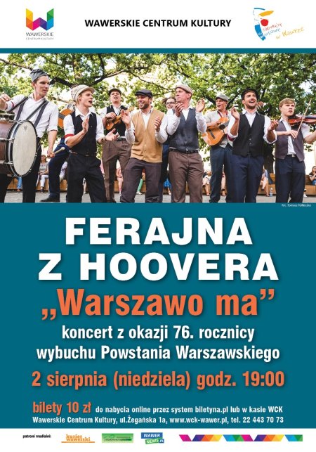 Zapraszamy na koncert z okazji 76. rocznicy wybuchu Powstania Warszawskiego. Wystąpi zespół Ferajna z Hoovera. W repertuarze pojawią się pieśni powstańcze oraz piosenki staro-warszawskie. Przed koncertem będzie można obejrzeć wystawę fotogramów ukazujących przedwojenną Warszawę.