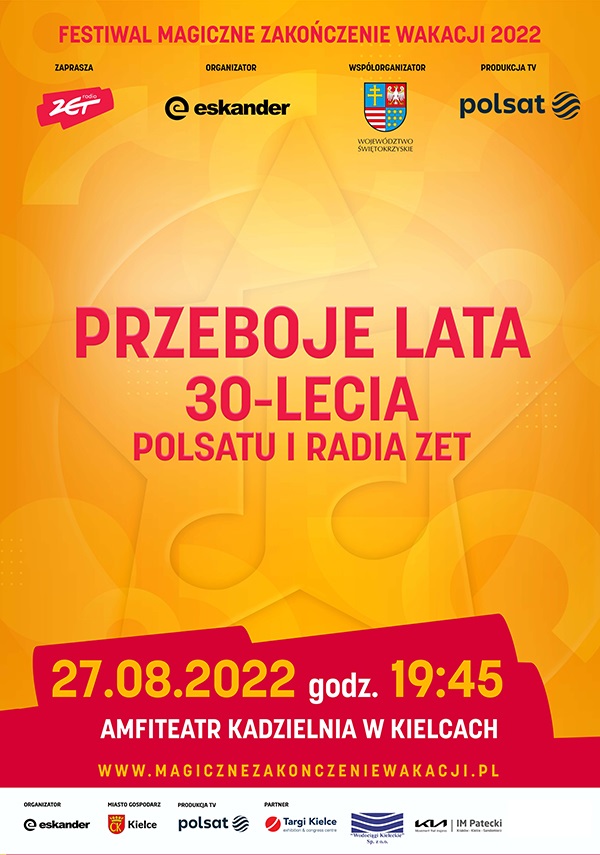 Sobotni wieczór Festiwalu Magiczne Zakończenie Wakacji w kieleckiej Kadzielni to największa letnia impreza ostatnich 30 lat! Przeboje lata 30-lecia Polsatu i Radia Zet rozbujają najpiękniejszy Amfiteatr w Polsce. Na scenie największe polskie gwiazdy, których hity królowały na wakacyjnych listach przebojów od lat i te najnowsze przeboje, bez których nie wyobrażamy sobie lata, a także wyjątkowi zagraniczni goście.