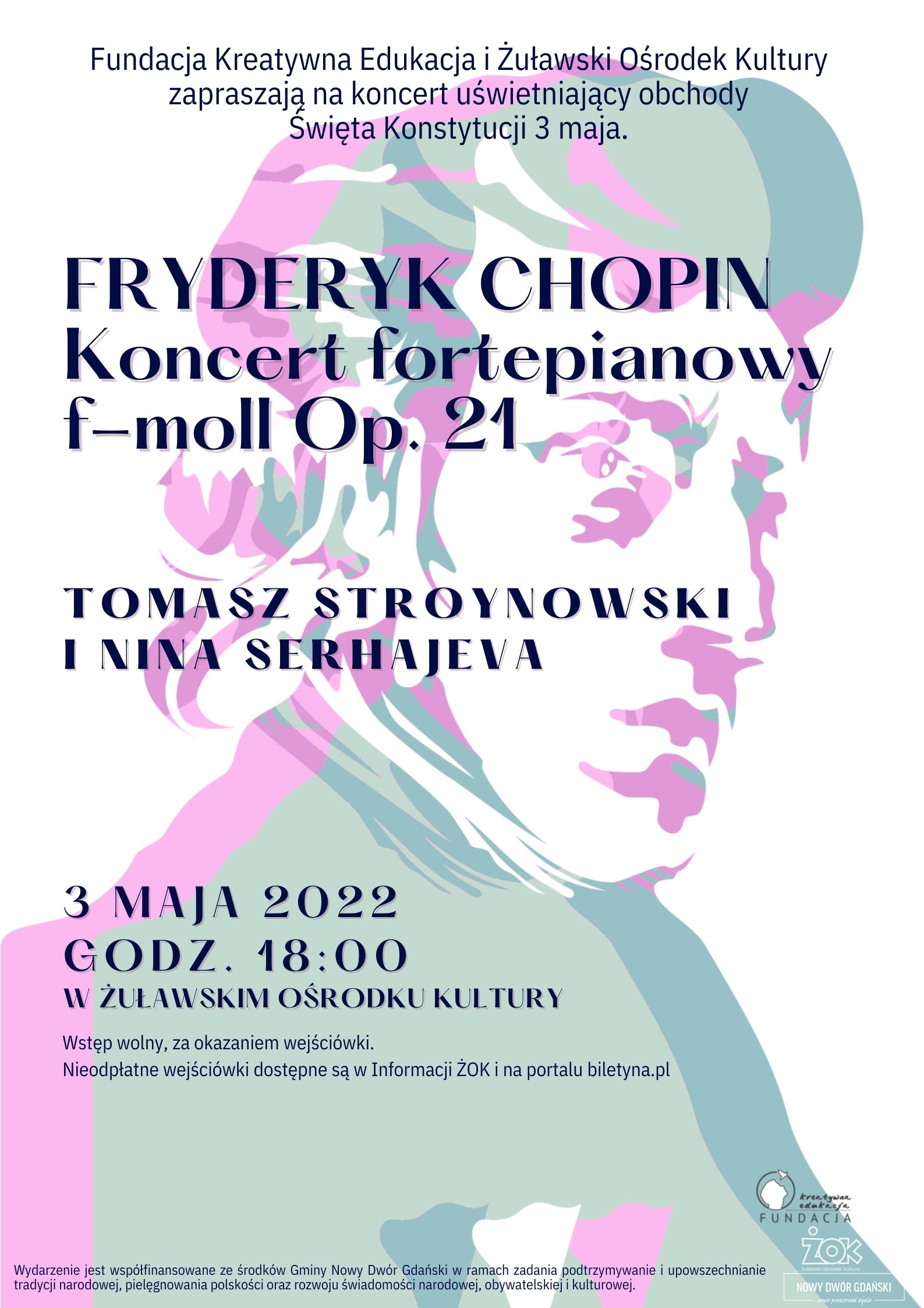 Fundacja Kreatywna Edukacja i Żuławski Ośrodek Kultury w Nowym Dworze Gdańskim zapraszają na koncert uświetniający obchody Święta Konstytucji 3 Maja - FRYDERYK CHOPIN Koncert fortepianowy f - moll Op. 21