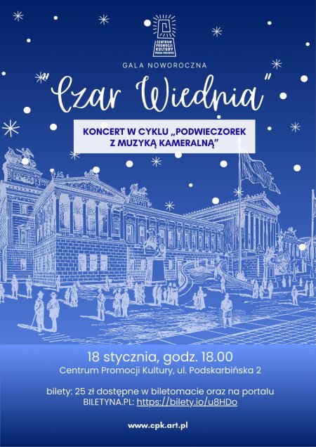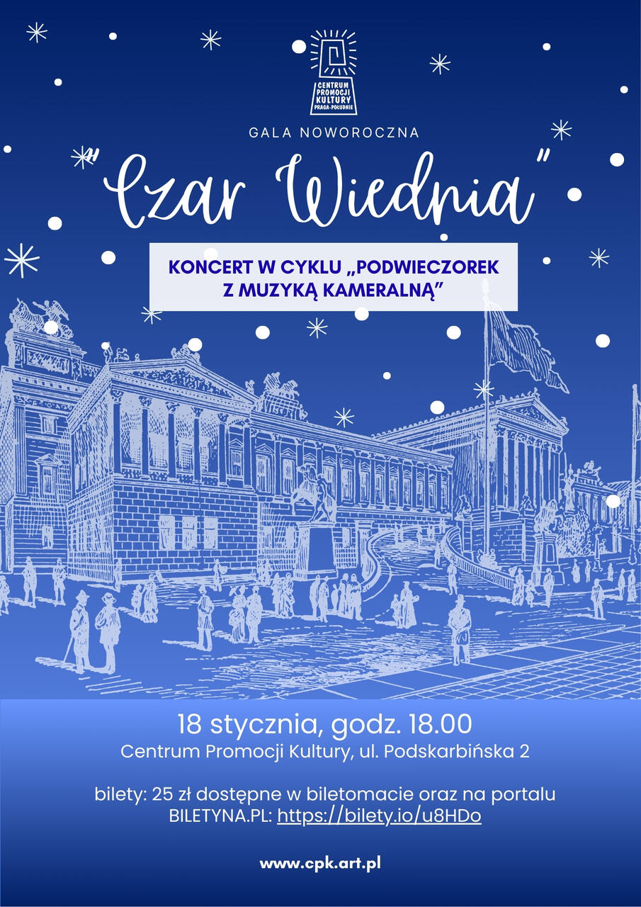 Gala Noworoczna – „Czar Wiednia”. Koncert w cyklu „Podwieczorek z muzyką kameralną”. Gospodynią wieczoru będzie Grażyna Mądroch – sopran koloraturowy, przy fortepianie zasiądzie Adam Sychowski.