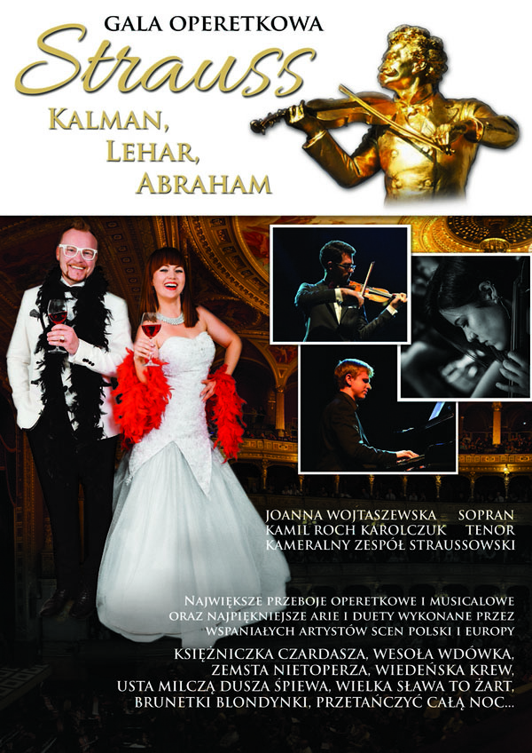 Koncert GALA OPERETKOWA odbywa się w całej Polsce oraz Europie. Za sprawą wspaniałych artystów przeniosą się Państwo do cudownego i wyjątkowego świata Operetki i Musicalu, pełnego miłości, czułości, wzruszeń, namiętności, gorących pocałunków... Usłyszycie Państwo najpiękniejsze i najznakomitsze melodie muzycznego króla walca Johanna Straussa jak również Emmericha Kalmana, Franza Lehara, Paula Abrahama. Zabrzmią duety wszech czasów: "Usta milczą, dusza śpiewa" "Co się dzieje, oszaleję", "W rytm walczyka", "Myszko, to była piękna noc", wspaniałe arie: "Aria ze śmiechem", popisowe utwory instrumentalne, jak i piosenki z repertuaru Jana Kiepury: "Brunetki, blondynki" oraz duety musicalowe, a to wszystko podane na najwyższym poziomie. Gala cieszy się wielkim powodzeniem i uznaniem, za sprawą porywających solistów, Joanny Wojtaszewskiej oraz Kamila Rocha Karolczuka, ich poruszającej i subtelnej gry scenicznej, fantastycznego kontaktu z publicznością oraz wdzięku i uroku osobistego a do tego niesamowitej wrażliwości oraz muzykalności. Repertuar zaczerpnięty z najbardziej znanych i lubianych Operetek oraz Musicali, takich, jak: "Zemsta Nietoperza", "Księżniczka Czardasza", "Wesoła Wdówka", "Baron Cygański", "Wiedeńska krew", "My Fair Lady" czy "Upiór w Operze". Śpiewakom towarzyszy wspaniały, Kameralny Zespół Straussowski, składający się z wybitnie uzdolnionych artystów nowego pokolenia muzycznego.