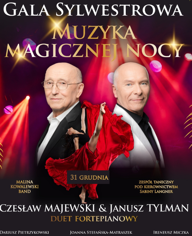 Magiczną moc sylwestrowej nocy poczują Państwo dzięki rewelacyjnym Artystom, gwiazdom telewizyjnego programu rozrywkowego Śpiewające fortepiany. W roli gospodarzy - znakomity duet fortepianowy – Czesław Majewski i Janusz Tylman. Na scenie wystąpią ujmujący głosem i sceniczną charyzmą soliści - Joanna Stefańska-Matraszek – sopran i Ireneusz Miczka – baryton. Towarzyszyć im będzie Malina Kowalewski Band, który tworzą muzycy wirtuozi. Całości dopełnią piękne kreacje oraz ujmujący taniec w wykonaniu zespołu tanecznego w choreografii Sabiny Langner.