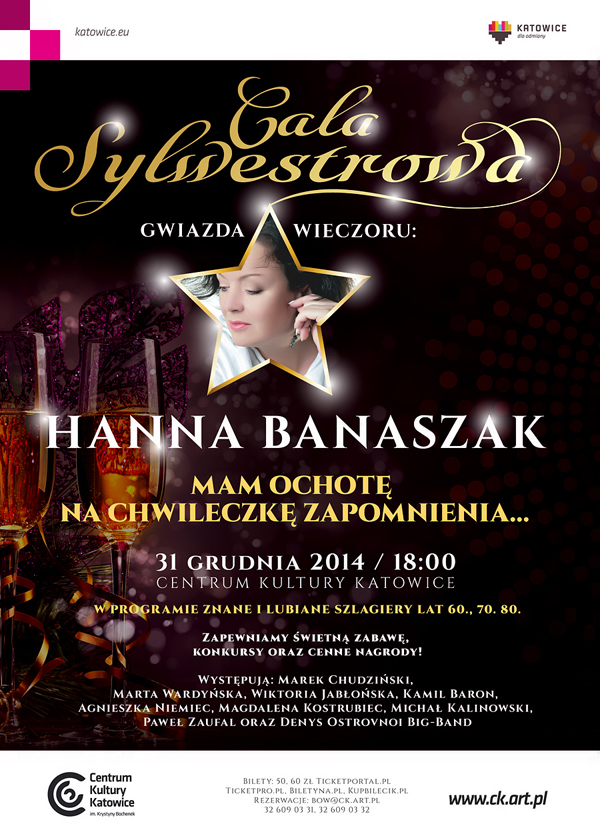 Niezapomniane szlagiery szalonych lat 60. 70. i 80 tych, wspaniałe teksty Agnieszki Osieckiej, Wojciecha Młynarskiego, Ernesta Brylla, Jonasza Kofty i Jeremiego Przybory... a do tego fenomenalny głos Hanny Banaszak pozwolą nam w ostatni wieczór 2014 roku na chwileczkę zapomnienia... Obok Hanny Banaszak wystąpią: Marek Chudziński, Marta Wardyńska, Wiktoria Jabłońska, Kamil Baron, Agnieszka Niemiec, Magdalena Kostrubiec, Paweł Zaufal oraz Denys Ostrovnoi Big-Band.