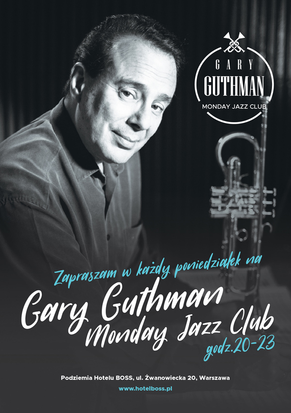 Amerykański trębacz, jeden z najznamienitszych na świecie, postanowił otworzyć autorski klub jazzowy w podziemiach Hotelu Boss w Warszawie-Wschodniej. Gary Guthman Monday Jazz Club powita gości w poniedziałek 25 września od godz. 20:00 do 23:00 w Hotelu Boss przy ul. Żwanowieckiej 20 (tel.22-5166100). W każdy poniedziałek publiczność będzie mogła delektować się odmiennymi tematycznie programami muzycznymi. W drugich częściach wieczoru wystąpią młode gwiazdy polskiej wokalistyki jazzowej. Wyboru artystek dokonał sam Gary Guthman, który będzie gospodarzem, kompozytorem, wokalistą i główny showmanem koncertów. Towarzyszyć mu będą muzycy nie potrzebujący żadnych rekomendacji: Wojciech Gogolewski – fortepian, Paweł Pańta – bas oraz Adam Lewandowski – perkusja.