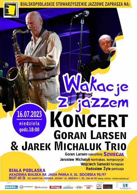 Bialskopodlaskie Stowarzyszenie Jazzowe zaprasza na "Wakacje z Jazzem" w ramach których odbędzie się koncert Goran Larsen & Jarek MichalukTrio/Szwecja/PL/ -16 lipca 2023 godz.18.00 Biała Podlaska, Akademia Bialska ul. Sidorska 95/97