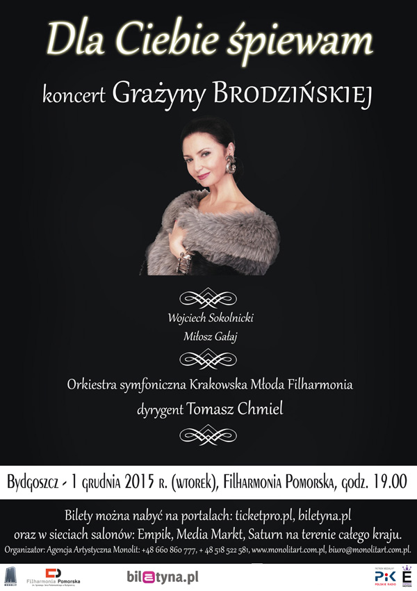Grażyna Brodzińska (sopran) - Pierwsza Dama Polskiej Operetki. Króluje na scenie i podbija serca publiczności na całym świecie. Perfekcyjna w każdym geście, obdarowująca widzów delikatną wirtuozerią głosu. Prezentując najwyższy kunszt sztuki wokalnej, swoim repertuarem obejmuje zarówno klasykę, musical jak i światowe przeboje z gatunku różnych nurtów muzycznych. Zachwyca widzów głosem, elegancją i temperamentem.