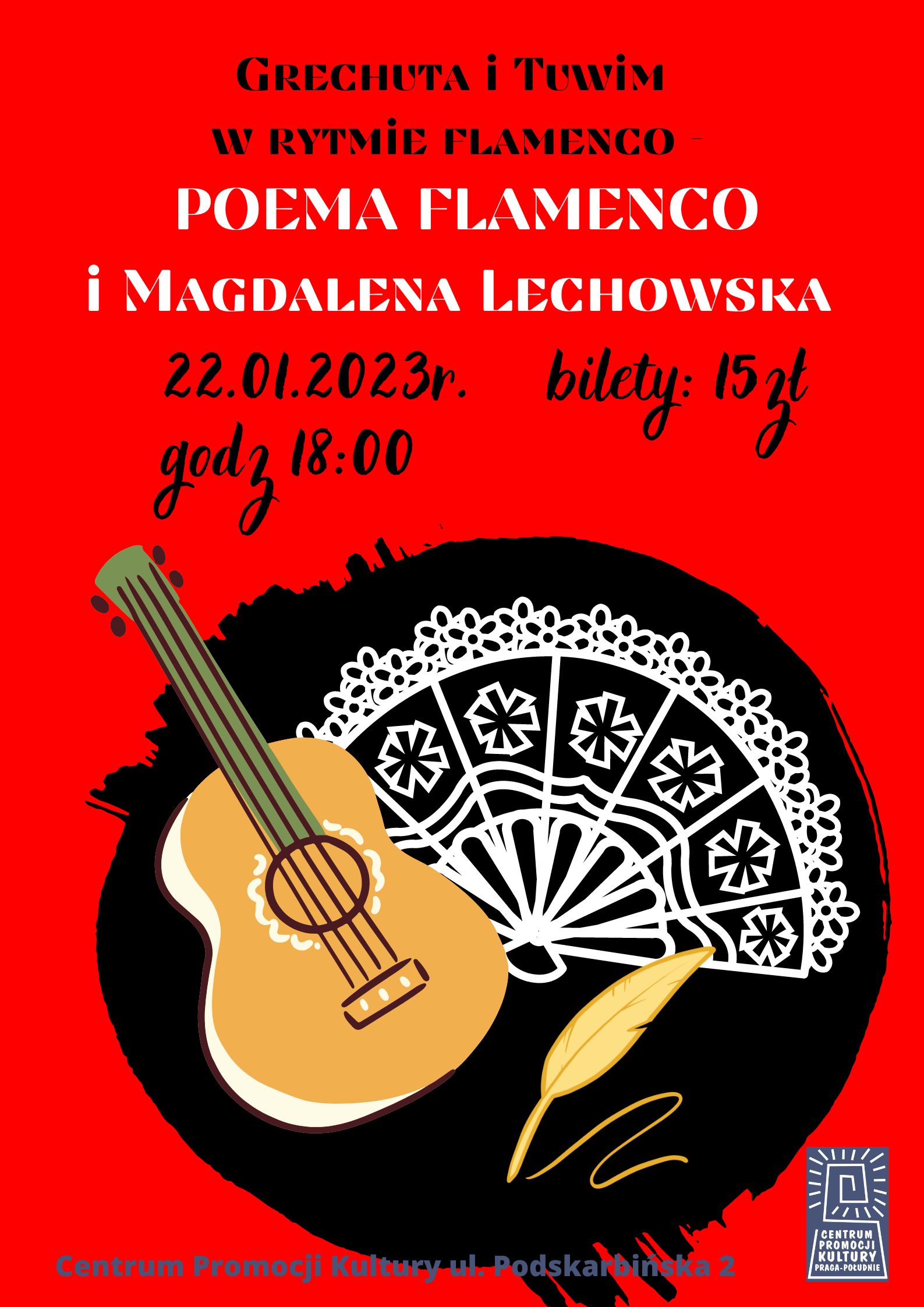 „Grechuta i Tuwim w Rytmie Flamenco” Magdalena Lechowska i POEMA FLAMENCO. Magdalena Lechowska Polska wokalistka o latynoskiej duszy. Urodziła się w Krakowie ale wychowała w Ameryce Południowej! Laureatka konkursu na interpretację piosenek Marka Grechuty w ramach Grechuta Festival 2011.Jedyna śpiewaczka w kraju oddająca wiernie cygański temperament śpiewu flamenco! Wraz z wybitnymi i doświadczonymi artystami flamenco: Kaja Będkowska-Klar (taniec), Viola Bednarczyk (taniec) i Damian Kowaliński (gitara) tworzą formację POEMA FLAMENCO. To unikatowe