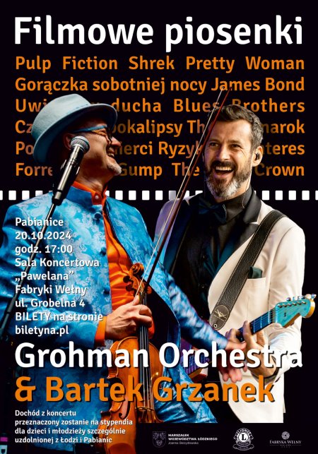 PIOSENKI Z FILMÓW to najnowszy projekt Grohman Orchestra i wokalisty Bartka Grzanka, który premierę miał na koniec lata 2023. Gramy wielkie przeboje z kasowych filmów m. in: Oh, Pretty Woman (Roy Orbison), Gorączka sobotniej nocy z repertuaru Bee Gees, Shrek (Halleluyah, Leonard Cohen), Thor (Kashmir,Led Zeppellin), Speed ( Every Breath You Take,The Police), Czas Apokalipsy(Riders on the storm,The Doors), Uwierz w ducha (Unchained Melody), Blues Brothers (Minnie the Moocher I Everybody Need Sombody) i wielu innych. Radość, zabawa i brawurowe wykonania utworów specjalnie zaaranżowanych przez Leszka Kołodziejskiego dla tego projektu.