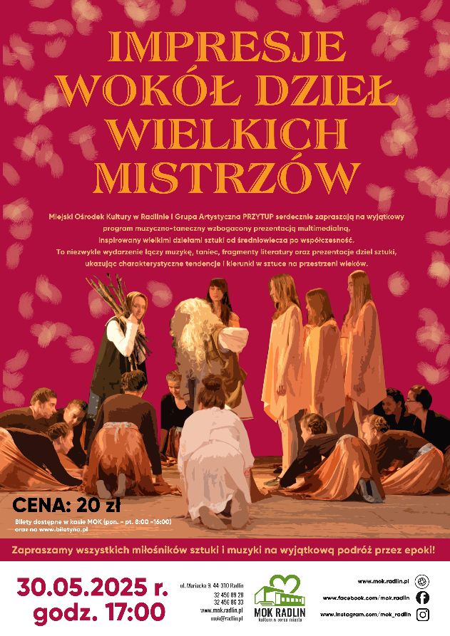 Miejski Ośrodek Kultury w Radlinie i Grupa Artystyczna PRZYTUP serdecznie zapraszają na wyjątkowy program muzyczno-taneczny wzbogacony prezentacją multimedialną, inspirowany wielkimi dziełami sztuki od średniowiecza po współczesność.