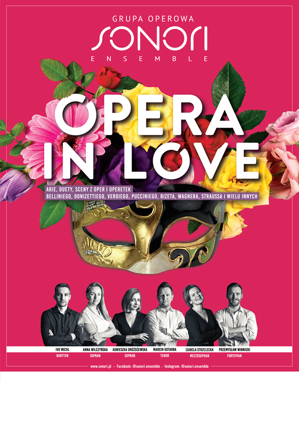 Miłość ma wiele twarzy! Zapraszamy na wyjątkowy wieczór z operą, operetką, musicalem, piosenką i przebojową muzyką fortepianową inspirowany różnymi barwami miłości Program koncertu oparto na czterech kolorach miłości. Pierwszą część tworzą kompozycje inspirowane miłością. Usłyszą Państwo kompozycje Ludwiga van Beethovena ("Dla Elizy") pieśni Roberta Schumanna i Jonathana Dove'a oraz scenę z opery Piotra Czajkowskiego "Dama pikowa". Następnie opowiemy muzyką o miłości spełnionej. Obok słynnego chóru weselnego z opery "Lohengrin" Richarda Wagnera pełnię miłości ukażą fragmenty z operetki "Zemsta nietoperza" Johanna Straussa syna i musicalu "Sweeney Todd" Stephena Sondheima, a muzyczną impresję i nastrój stworzy muzyka Claude'a Debussy'ego. W drugiej części kontrast pomiędzy odcieniami miłości stanie się bardzo wyraźny. Pierwszą paletę stanowić będą ciemne kolory ilustrujące miłość nieszczęśliwą, a nawet tragiczną. Zabrzmią kompozycje Henry'ego Purcella, Piotra Czajkowskiego i Sergiusza Rachmaninowa, a całość oplecie słynny motyw Romea i Julii Sergiusza Prokofiewa. Na koniec zabierzemy Państwa w świat kolorowej, słodkiej, amerykańskiej miłości, malowanej dźwiękami musicali i popularnych piosenek. Zabrzmią takie przeboje, jak "When I fall in love", "Something stupid", "Love song" czy wreszcie "L-O-V-E". Wyjątkowy koncert poświęcony kolorom miłości spędzą Państwo w towarzystwie śpiewaków operowych, znakomitych solistów z Pragi, Krakowa i Wrocławia. Całość oprawi wirtuozowska gra fortepianowa w wykonaniu Przemysława Winnickiego oraz słowo wiążące. Serdecznie zapraszamy na tę niepowtarzalną muzyczną opowieść o miłości! Grupa Sonori Ensemble ma na swoim koncie ponad 350 koncertów w salach koncertowych, teatrach i innych instytucjach kultury Polsce i za granicą (Austria, Niemcy, Włochy, Słowacja). Do ważniejszych osiągnięć należą: występy z Orkiestrą Filharmonii Zielonogórskiej, trzykrotny występ podczas Nowosolskiej Jesieni Artystycznej, gdzie artyści koncertowali m.in. obok Grupy MoCarta oraz orkiestry Arte dei Suonatori, koncert w ramach prestiżowego cyklu "Wieczory u Attavantich" w Jarosławiu, spektakl "Mozartiada" podczas festiwalu Drama Teatralna w Tarnobrzegu.