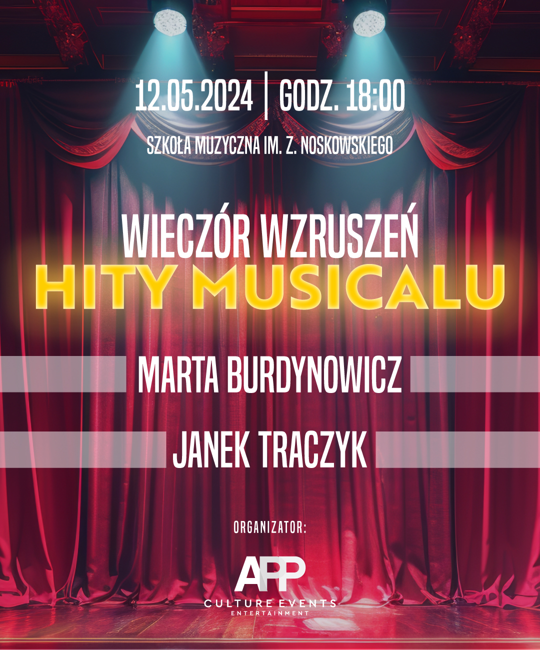 Zapraszamy Was na koncert z największymi musicalowymi hitami wszechczasów. Wieczór pełen wspaniałych dźwięków i wzruszeń zagwarantuje duet wspaniałych artystów: Marta Burdynowicz oraz Janek Traczyk. Słyszymy się już 12 maja w Szkole Muzycznej im. Z. Noskowskiego w Gdyni!