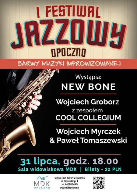 31 lipca 2021 (sobota) w Miejskim Domu Kultury w Opocznie wydarzenie jakiego jeszcze nie było: I Festiwal Jazzowy - Barwy Muzyki Improwizowanej. Na scenie MDK wystąpią wyjątkowi artyści, muzycy, których nikomu nie trzeba przedstawiać, prawdziwi frontmani polskiej sceny jazzowej.