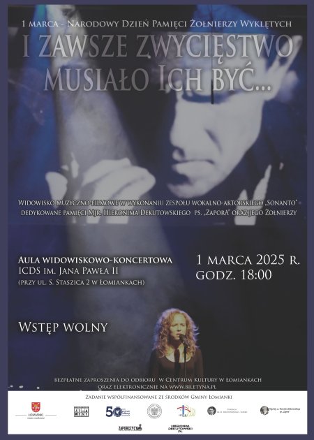 W imieniu Miasta Łomianki, Stowarzyszenia WEST, Centrum Kultury w Łomiankach, Instytutu Pamięci Narodowej, Integracyjnego Centrum Dydaktyczno-Sportowego w Łomiankach, wreszcie w imieniu Fundacji im. Hieronima Dekutowskiego „Zapory”, Rajdu mjra cichociemnego Hieronima Dekutowskiego ps. „Zapora” oraz zespołu wokalno-aktorskiego „Sonanto”, serdecznie zapraszamy Państwa na otwarte widowisko muzyczno-filmowe pt. „I zawsze zwycięstwo musiało Ich być…”, dedykowane pamięci Hieronima Dekutowskiego „Zapory” oraz jego żołnierzy. Wydarzenie zostało przygotowane specjalnie na Narodowy Dzień Pamięci Żołnierzy Wyklętych. Serdecznie zapraszamy także w imieniu portali www.Zaporczycy.com.pl oraz www.HieronimDekutowski.pl.