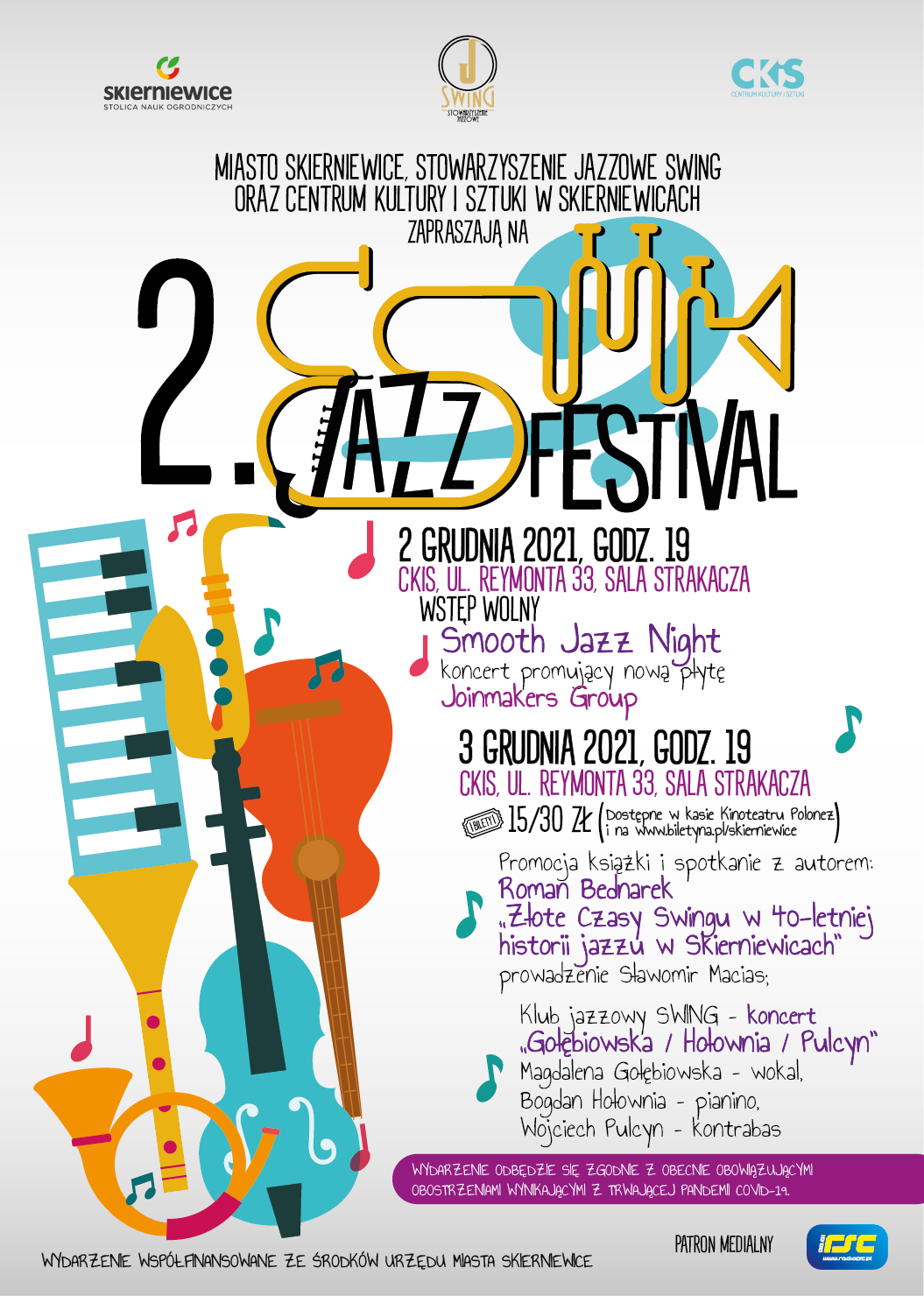 Stowarzyszenie Jazzowe Swing we współpracy z Miastem Skierniewice oraz Centrum Kultury i Sztuki w Skierniewicach, w ramach II ES jazz Festival, zapraszają na wieczór jazzowy, na który złożą się: spotkanie z Romanem Bednarkiem, autorem książki: "Złote Czasy Swingu w 40-letniej historii jazzu w Skierniewicach" oraz organizowany pod szyldem Klubu jazzowego SWING koncert standardów jazzowych w wykonaniu znakomitego trio "Gołębiowska/Hołownia/Pulcyn". Na scenie gościć będziemy ulubieńców skierniewickiej publiczności jazzowej: Bogdana Hołownię (pianino) oraz Wojciecha Pulcyna (kontrabas) - muzyków, którzy wielokrotnie pojawiają się na stronach książki Romana Bednarka. Towarzyszyć im będzie Madalena Gołębiowska, jedna z najciekawszych wokalistek jazzowych młodego pokolenia.