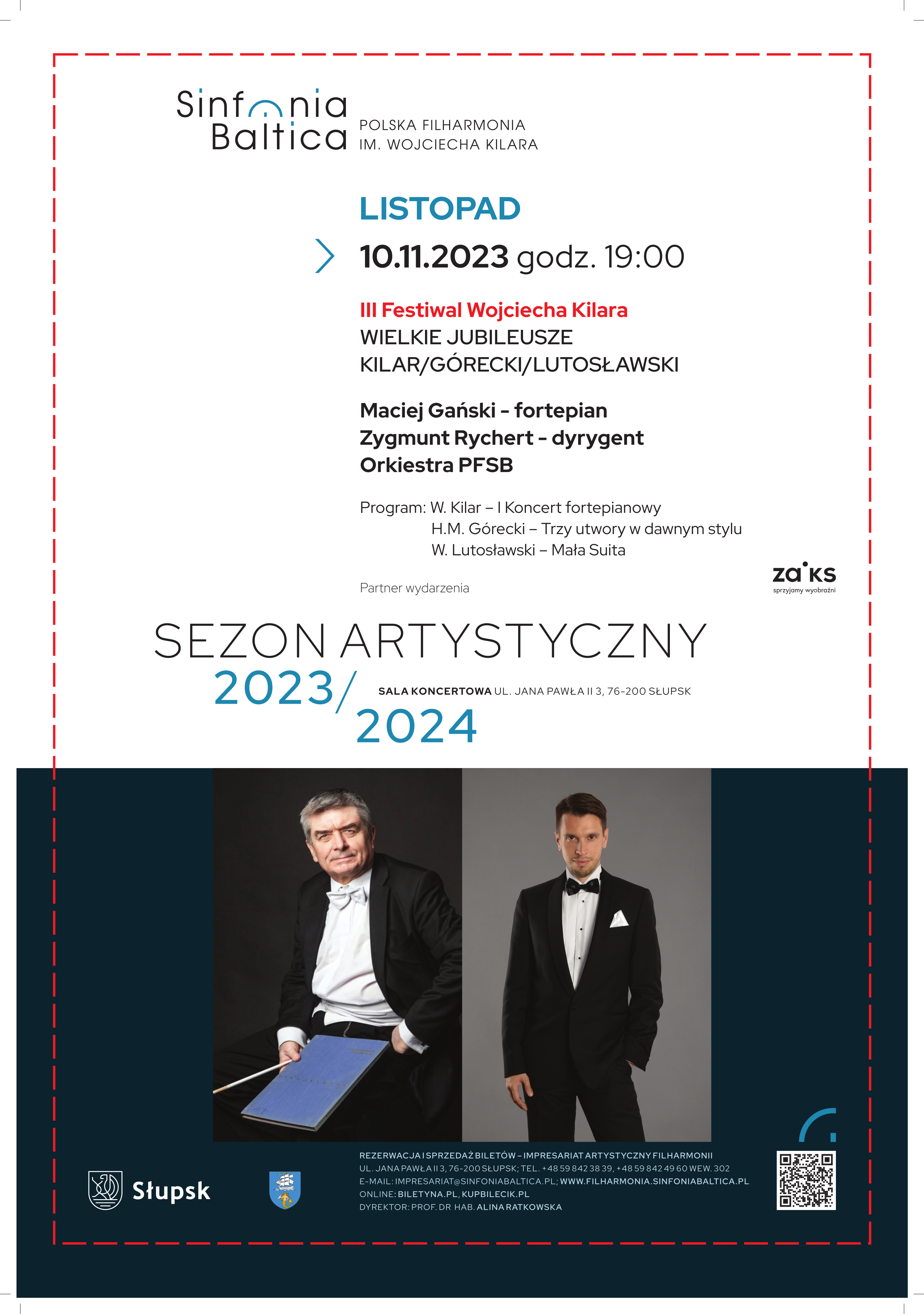 W 2023 roku przypadają aż trzy rocznice związane z trójką wielkich polskich kompozytorów muzyki XX wieku. 110 lat temu - 25 stycznia 1913 r. urodził się Witold Lutosławski, 6 grudnia mija 90 lat od narodzin Henryka Mikołaja Góreckiego, natomiast 29 grudnia obchodzić będziemy 10 rocznicę śmierci patrona naszej filharmonii – Wojciecha Kilara. Z tej okazji orkiestra Polskiej Filharmonii Sinfonia Baltica im. Wojciecha Kilara pod batutą maestro Zygmunta Rycherta zaprezentuje dzieła wspomnianych twórców: I koncert fortepianowy Wojciecha Kilara, Trzy utwory w dawnym stylu Henryka Mikołaja Góreckiego i Małą Suitę Witolda Lutosławskiego. Solistą wieczoru będzie wybitny pianista z Gdańska Maciej Gański.