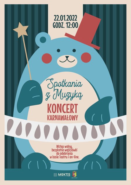 Jak karnawał, to karnawał! Podczas tego muzycznego spotkania będziemy poznawać różne tańce karnawałowe, od najstarszych, np. menueta, gawota czy poloneza. Sprawdzimy, przy jakiej muzyce bawią się dzieci w różnych krajach. Wykonawcami będą uczniowie i nauczyciele Prywatnej Szkoły Muzycznej Nr 1 w Otwocku.