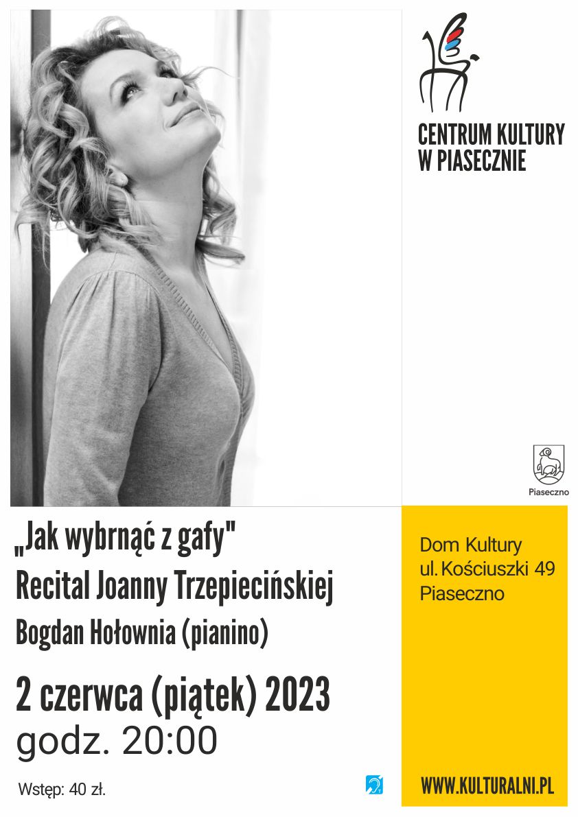 Jak wybrnąć z gafy to nowy recital Joanny Trzepiecińskiej, aktorki Teatru Polskiego w Warszawie. Program złożony jest z utworów, które są perłami polskiej piosenki kabaretowej - tej przedwojennej , tej spod znaku Kabaretu Starszych Panow i tej tworzonej dzisiaj. Każdy utwór to zabawna historia opowiadająca perypetie wynikające z relacji damsko-męskich. Całość przeplatana jest pełnym anegdot komentarzem. Spotkanie z tym repertuarem każdego wprowadzi w doskonały humor. Aktorce towarzyszy świetny pianista jazzowy i niezrównany „pogrzebacz” dowcipów - Bogdan Hołownia.