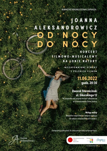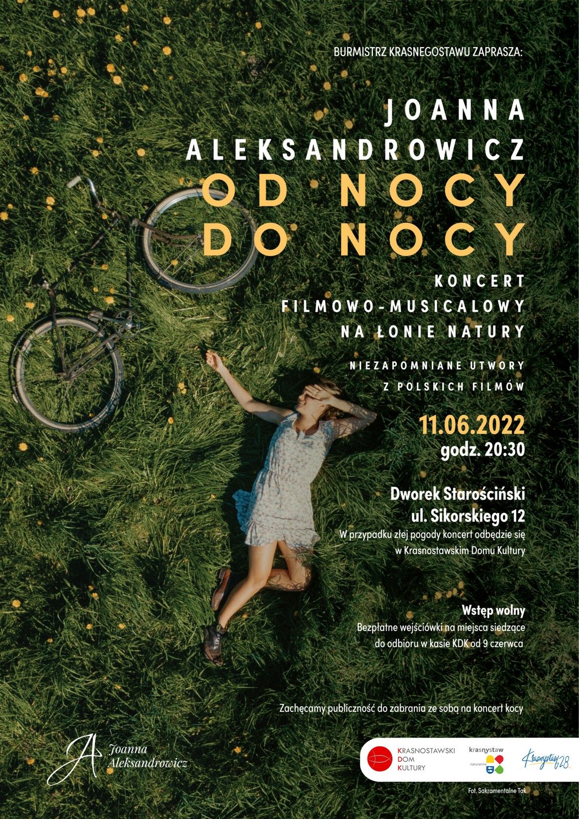 Burmistrz Krasnegostawu i Krasnostawski Dom Kultury serdecznie zapraszają na koncert z okazji 628. rocznicy nadania Miastu Krasnystaw praw miejskich. Przy Dworku Starościńskim 11 czerwca 2022 r. o godz. 20:30 wystąpi Joanna Aleksandrowicz z zespołem w koncercie polskiej muzyki filmowej „Od Nocy Do Nocy”.
