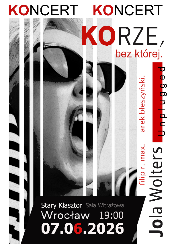 Wyjątkowy koncert w 75. rocznicę urodzin Kory „KORZE, bez której” to koncert, który nie zaczyna się od dźwięku, lecz od historii. Od roku 1980, kiedy młoda dziewczyna w telewizji po raz pierwszy ujrzała Korę. Ta dziewczyna dziś ma ponad 40 lat doświadczenia scenicznego i nazywa się Jolanta Wolters. Już wtedy w piosenkach Kory znalazła ujście dla swoich emocji. Kora stała się jej punktem zwrotnym, zobaczona przypadkiem, zapamiętana na zawsze. Jola nie naśladuje, nie mierzy się z legendą, prowadzi emocje równie świadomie, spokojnie, mocno i bez kompromisów. Jej koncerty łączą teraźniejszość z przeszłością. Z czułością i wyczuciem zabiera słuchaczy w podróż do fascynującego świata Kory - do wspomnień, refleksji, poezji - w osobistej narracji. Publiczność usłyszy takie utwory jak: "Eksplozja", „Zdrada“, „Cykady na Cykladach", "Krakowski Spleen", "Kreon", "Paranoja“, "„Jestem kobietą“ i wiele innych. Jolanta Wolters to piosenkarka i aktorka pochodząca z Zielonej Góry, mieszkająca od lat w Duisburgu (Niemcy). Już jako dziecko kochała muzykę, teatr i marzyła, by stać na scenie i śpiewać. Po narodzinach jej trójki dzieci, mając 24 lata, stopniowo, lecz z pełną determinacją postanowiła zawalczyć o swoje marzenia. Współpracowała z lokalnymi zespołami muzycznymi, brała udział w konkursach wokalnych. Za namową przyjaciół rozpoczęła pracę w Teatrze Lubuskim, gdzie odkryła fascynację piosenką aktorską. W 1994 roku zagrała główną rolę śpiewaną w spektaklu „Transfuzja” w reżyserii Tomasza Dutkiewicza. W kolejnych latach podpisała serię muzycznych kontraktów w Dubaju, Jordanii, a także w Niemczech, gdzie idąc za głosem serca, pozostała. Początkowo śpiewała z różnymi formacjam muzycznymi, w różnych stylach, jednak w roku 2002, powróciła do tego co kochała najbardziej - do piosenki literackiej. Koncertując w Niemczech i Francji, zbiera znakomite recenzje. Jej niezwykła ekspresja i warunki głosowe pozwalają poruszać się zarówno w repertuarze lirycznym, jak i rockowym. Serca publiczności i krytyków zdobywa wykonując utwory Agnieszki Osieckiej, Marleny Dietrich, Kory, Edith Piaf, Jerzego Satanowskiego, Jacquesa Brela… – „Fenomenalna”, „Mistrzyni każdego stylu” (gazeta Westdeutsche Allgemeine Zeitung). Artystka wydała płyty z piosenką aktorską i poezją śpiewaną w języku polskim i niemieckim. W 2022 roku ukazały się jej dwa szczególnie bliskie sercu albumy: - „KORZE, bez której” – poświęcony twórczości Kory z koncertem pro mocyjnym w Piwnicy pod Baranami. - „Wierszowa Kraina” – klasyka polskiej poezji dziecięcej, z gościnnym udziałem znanego aktora i reżysera Artura Barcisia. Towarzyszyć jej będą gitarzyści: Arkadiusz Błeszyński (gitara solowa i harmonijka ustna) i Filip R. Max (gitara rytmiczna i wokal). Arkadiusz Błeszyński - to gitarzysta bluesowy, kompozytor, autor tekstów i aranżer, współzałożyciel wielu formacji muzycznych, między innymi „Casus reggae”, „Schau-Pau Acoustic Blues” czy „The Blair Witch Project & Jan Błędowski”. Napisał muzykę do kilku spektakli teatralnych, min. „Wesele” Stanisława Wyspiańskiego w reżyserii Jerzego Stuhra i Michała Noconia. Filip R. Max - Wokalista rockowy, gitarzysta, kompozytor, aranżer. Lider grupy rockowej „Prohibicja”, z którą odnosił sukcesy, zdobywając m.in. główną nagrodę na May Day Rock Festival w Głogowie, Festiwalu Rockowym w Kaliszu oraz Lubuskim Festiwalu Rockowym w Zielonej Górze. Laureat pierwszej nagrody dla wokalistów „Mikrofon Prawdy”. Występował również w spektaklach teatralnych w Teatrze Lubuskim. Głosy prasowe, organizatorów i słuchaczy: „Tęsknota w jej głosie jest prawie namacalna“- gazeta Westdeutsche Allgemeine Zeitung "Fenomenalna polska piosenkarka“ – gazeta Rheinische Post "Bliska mi ekspresja, dużo energii, bardzo mocny głos i przekaz" - Andrzej Zarycki (kompozytor