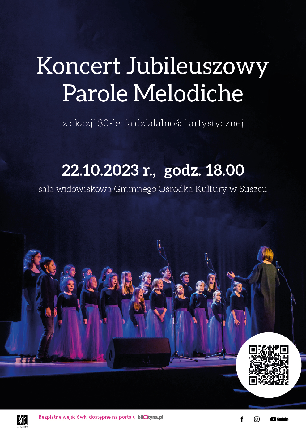W związku z obchodami jubileuszu 30-lecia działalności artystycznej chóru „Parole Melodiche” zapraszamy wszystkich absolwentów chóru na Koncert Jubileuszowy, który odbędzie się 22.10.2023 r. w Gminnym Ośrodku Kultury w Suszcu o godzinie 18.00.