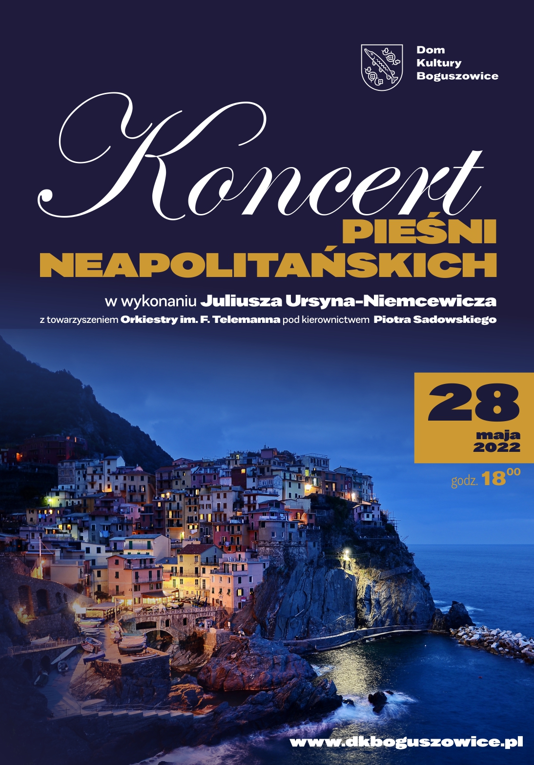 Zapraszamy na koncert pieśni neapolitańskich w wykonaniu znanego i cenionego tenora Juliusza Ursyna-Niemcewicza z towarzyszeniem Orkiestry im. F. Telemanna pod kierownictwem artystycznym Piotra Sadowskiego.
