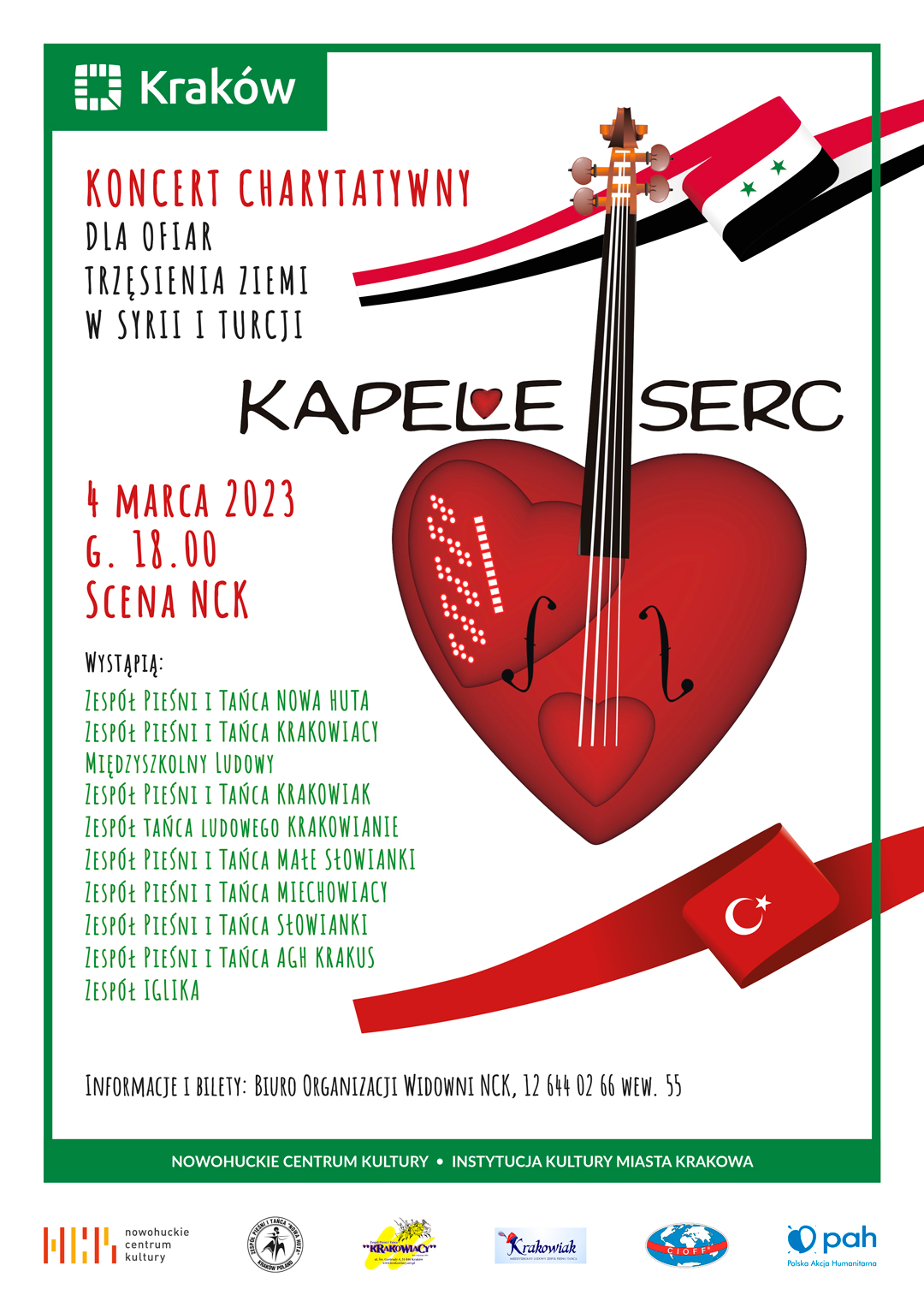 Trzynasta edycja ogólnopolskiej akcji w Nowohuckim Centrum Kultury, zainicjowanej przez Polską Sekcję Międzynarodowej Rady Stowarzyszeń Folklorystycznych, Festiwali i Sztuki Ludowej CIOFF. Podczas koncertu zorganizowana będzie zbiórka dla ofiar trzęsienia ziemi w Turcji i Syrii. Dochód przekazany zostanie Polskiej Akcji Humanitarnej.