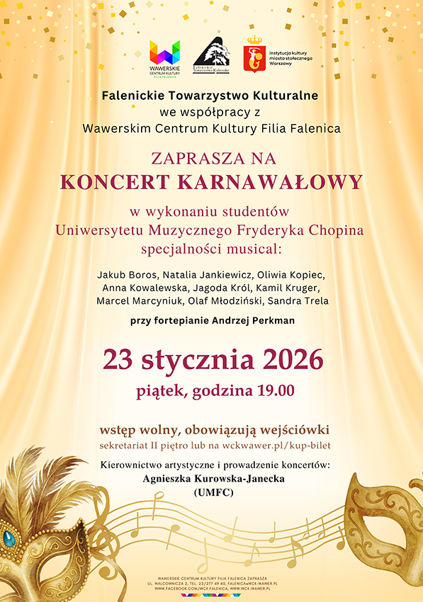 Falenickie Towarzystwo Kulturalne we współpracy z Wawerskim Centrum Kultury Filią Falenica zaprasza na Koncert karnawałowy w wykonaniu studentów Uniwersytetu Muzycznego Fryderyka Chopina specjalności