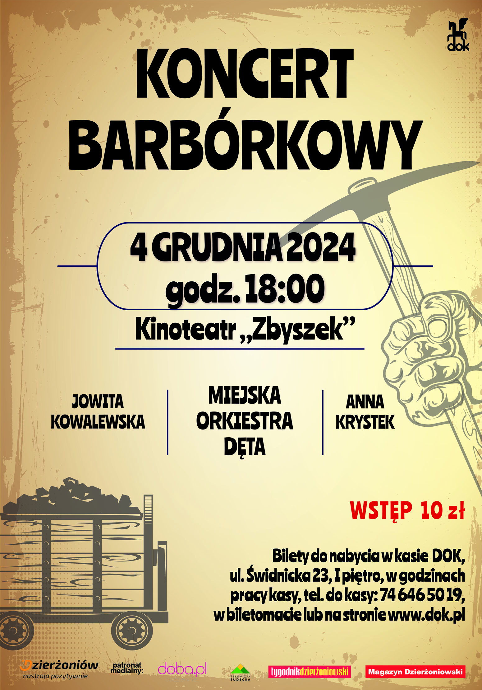 Dzierżoniowski Ośrodek Kultury zaprasza na Koncert Barbórkowy w wykonaniu Miejskiej Orkiestry Dętej pod batutą Dariusza Piechowiaka, śpiew Jowita Kowalewska i Anna Krystek.