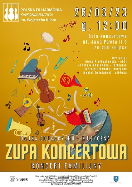 KONCERT FAMILIJNY. BAJKA EDUKACYJNO-MUZYCZNA ,, ZUPA KONCERTOWA"- Melodyjka, Rytmiczek, Harmoniczka i Altówek, czyli czworo świeżo zaprzyjaźnionych muzyków, kłóci się ze sobą o to, kto z nich jest najważniejszy. Gdy spostrzegają dzieci, wstydzą się swojego zachowania, przepraszają je i chcą zrobić coś jeszcze, co sprawi, że dzieciom będzie miło. W końcu postanawiają ugotować zupę koncertową. Jednak, to zadanie nie będzie łatwe i pojawi się poważna przeszkoda. Wszystko, okraszone piosenkami, muzyką instrumentalną, zabawnymi sytuacjami, ale także sporą porcją łatwo przyswajalnej wiedzy muzycznej, dobrze się kończy.