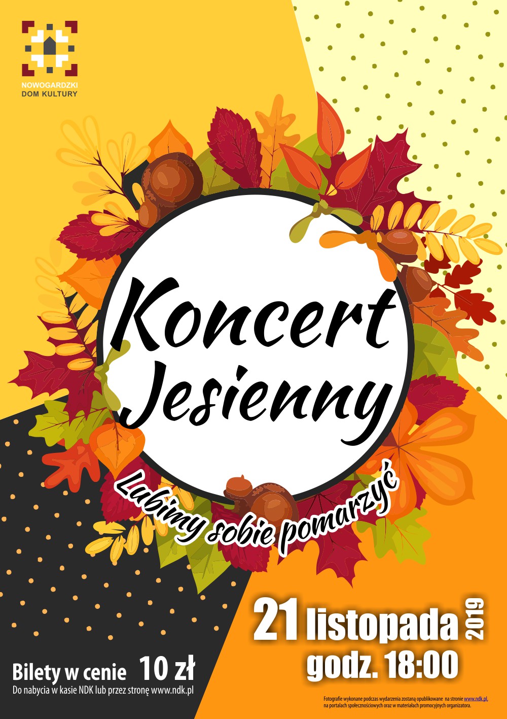 21.11.2019 r. o godz.18:00 zapraszamy na koncert jesienny pt.: „Lubimy sobie pomarzyć”. Zespół wokalny Animando oraz zespół instrumentalny AK-Centy przeniesie nas na piękne wrzosowiska otulone zielonym szalem traw. Będziemy mogli pospacerować z koszykiem pełnym rudych kasztanów oplecionych babim latem. Czy lubimy sobie pomarzyć? Oczywiście że tak. Jesień zachęca do refleksji. Przyjdźcie i przekonajcie się, czy już jesteście nastrojeni na chłodniejszą nutę, czy wciąż jeszcze drzemie w Was letni chochlik. Jesienne kompozycje w wykonaniu artystów z NDK okryją Was jak ciepły koc w pochmurne, szare dni, zachęcą do zatracenia się w sobie i snucia cudownych planów na przyszłość.