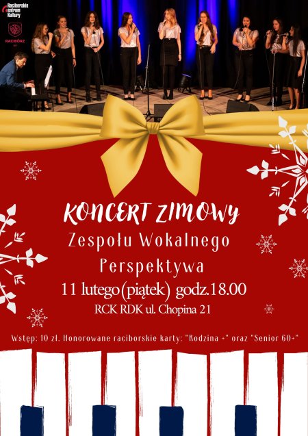 Serdecznie zapraszamy na koncert świąteczny w wykonaniu zespołu wokalnego Perspektywa. W programie pojawią się znane i mniej znane przeboje świąteczne oraz piosenki o tematyce zimowej. Utwory pochodzące z repertuaru naszych rodzimych oraz zagranicznych artystów takich jak: Bing Crosby, Brenda Lee, Stevie Wonder, Sia, Ariana Grande, TGD, Krzysztof Cugowski, Kuba Badach, Natalia Kukulska czy Roksana Węgiel. Usłyszymy współczesne popowe hity oraz świąteczne klasyki ubiegłego stulecia. Wokalistki zaprezentują się w zespole oraz występach solowych. Na pianinie akompaniował będzie Marek Kuder.