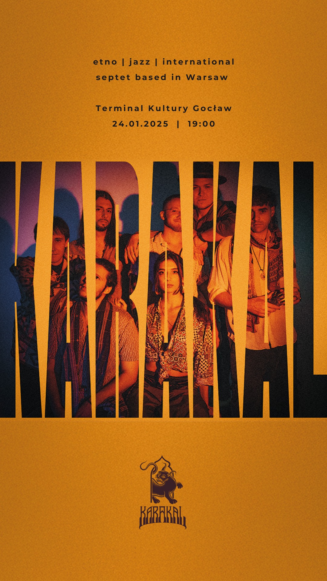 ☀️🌙 Ich muzyka jest jak pustynna noc, piach, dym kadzidła i opowieści przy ognisku. Karakal to siedmioosobowy, międzynarodowy zespół, czerpiący radość ze wspólnej wymiany energii i celebrujący szansę zabrania słuchaczy w pełną przygód odyseję. Dźwiękowy pejzaż zespołu utkany jest z kulturowych wpływów Persji, Syrii, Indii, Berberów, Anatolii czy Bałkanów. Muzyczny język Karakala jest wyjątkowy, pełen psychodelicznych, jazzowych i transowych rozwiązań. Wokalistką i autorką tekstów jest pochodząca z Turcji, Ayşe Abacı. Kierownik muzyczny zespołu, Wit Gudowski specjalizuje się w bliskowschodniej lutni - oud. Zespół sięga też po brzmienie takich orientalnych instrumentów jak saz czyli tureckiej lutni (Adam Winiarz) czy indyjskich skrzypiec - esraj (Tomasz Świstowski). Rytmikę i głębię zespołu napędzają Ramzi Attia (darbuka), Cyryl Skiba (perkusja/ perkusjonalia) oraz David Condis (fretless bass). W myśl zdania “jedność przez różnorodność”, łamią wszelkie bariery, spajając kultury w jedną, niesamowitą podróż.