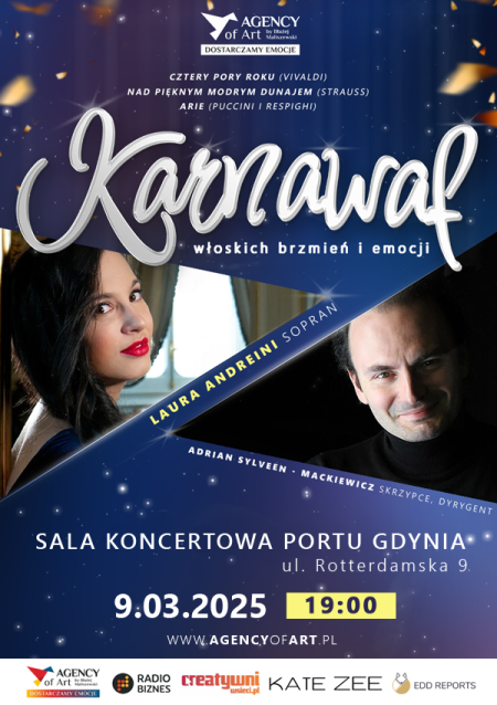 🎶 "Karnawał włoskich brzmień i emocji" ✨ Wyjątkowy koncert z najlepszymi utworami Vivaldiego, Pucciniego i Straussa, w wykonaniu Laury Andreini i Adriana Sylveena Mackiewicza. 🎻🎤 Zdobądź bilety na niezapomnianą muzyczną podróż! 🎟️