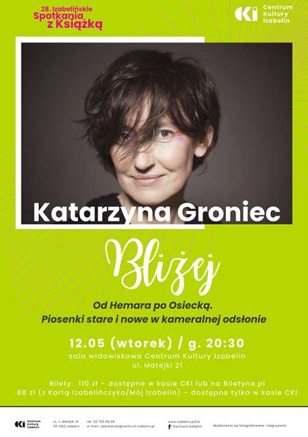 W ramach 28. Izabelińskich Spotkań z Książką zapraszamy na koncert Katarzyny Groniec pt. „Bliżej” w sali widowiskowej Centrum Kultury Izabelin.