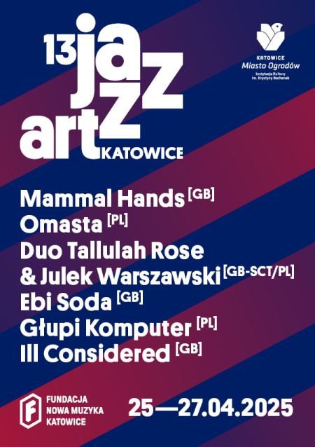Tegoroczny program dedykujemy oczywiście muzyce improwizowanej i eksperymentalnej, wywodzącej się częściej z klubów niż sal koncertowych, raczej zapatrzonej w ducha oporu i transgresji niż w bezpieczne tradycje. W 13 edycji KJAF zagrają zarówno międzynarodowe składy zakotwiczone w brytyjskiej scenie muzycznej Mammal Hands, Ebi Soda i Tallulah Rose&Julek Warszawski – jak i nowe, debiutujące właśnie polskie formacje: Omasta i Głupi Komputer. Łączy je poszukiwanie nowych form wyrazu, synteza jazzu z innymi gatunkami muzycznymi, wszelkie ich pogranicza.