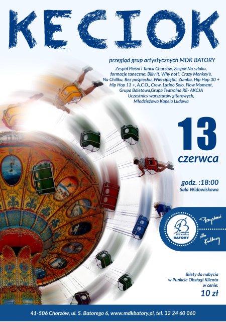 Cyklicznie w miesiącu czerwcu w Miejskim Domu Kultury ma miejsce wydarzenie artystyczne pn. KECIOK. Jest to koncert podsumowujący pracę grup artystycznych na co dzień działających w MDK Batory. Grupy na tę okoliczność przygotowują specjalne programy artystyczne. Do wykonawców należą grupy i formacje taneczne, instrumentaliści, zespoły wokalne, zespoły wokalno - taneczne. Serdecznie zapraszamy.
