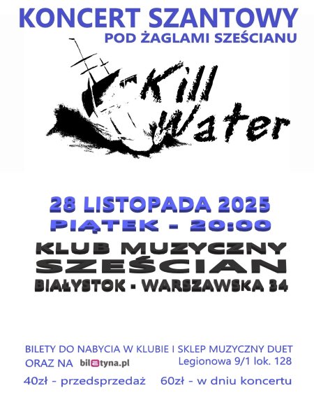 Zespół KILL WATER powstał w Białymstoku pod koniec 1994 roku. Założyli go studenci Politechniki Białostockiej. Wszystkich poza wspólnym muzykowaniem łączyła pasja do żeglarstwa, a pierwsze żeglarskie szlify zdobywali na jeziorze Rajgrodzkim w Y.C. ARCUS, z którym przez wiele lat związani byli członkowie zespołu. Próby na akademickim korytarzu skończyły się występem w klubie CoNieCo jako sprawdzian przed pierwszym festiwalem KOPYŚĆ94. Różne losy i przypadki sprawiły, że skład zespołu był bardzo zmienny. Do Kopyści97 ustabilizował się i nieprzerwanie dawał koncerty praktycznie w całej Polsce do 2004r.. Koleje losy sprawiły, że zespół zawiesił swoją działalność. Rodzina, praca i migracje uniemożliwiły spotykanie się na próbach i granie koncertów, aż do roku 2024, za sprawą lidera zespołu Macieja Czerwonko, który podjął się udanej próby wskrzeszenia zespołu. Po krótkiej, dwudziestoletniej przerwie, zespół rozpoczyna nowy rozdział swojej działalności.