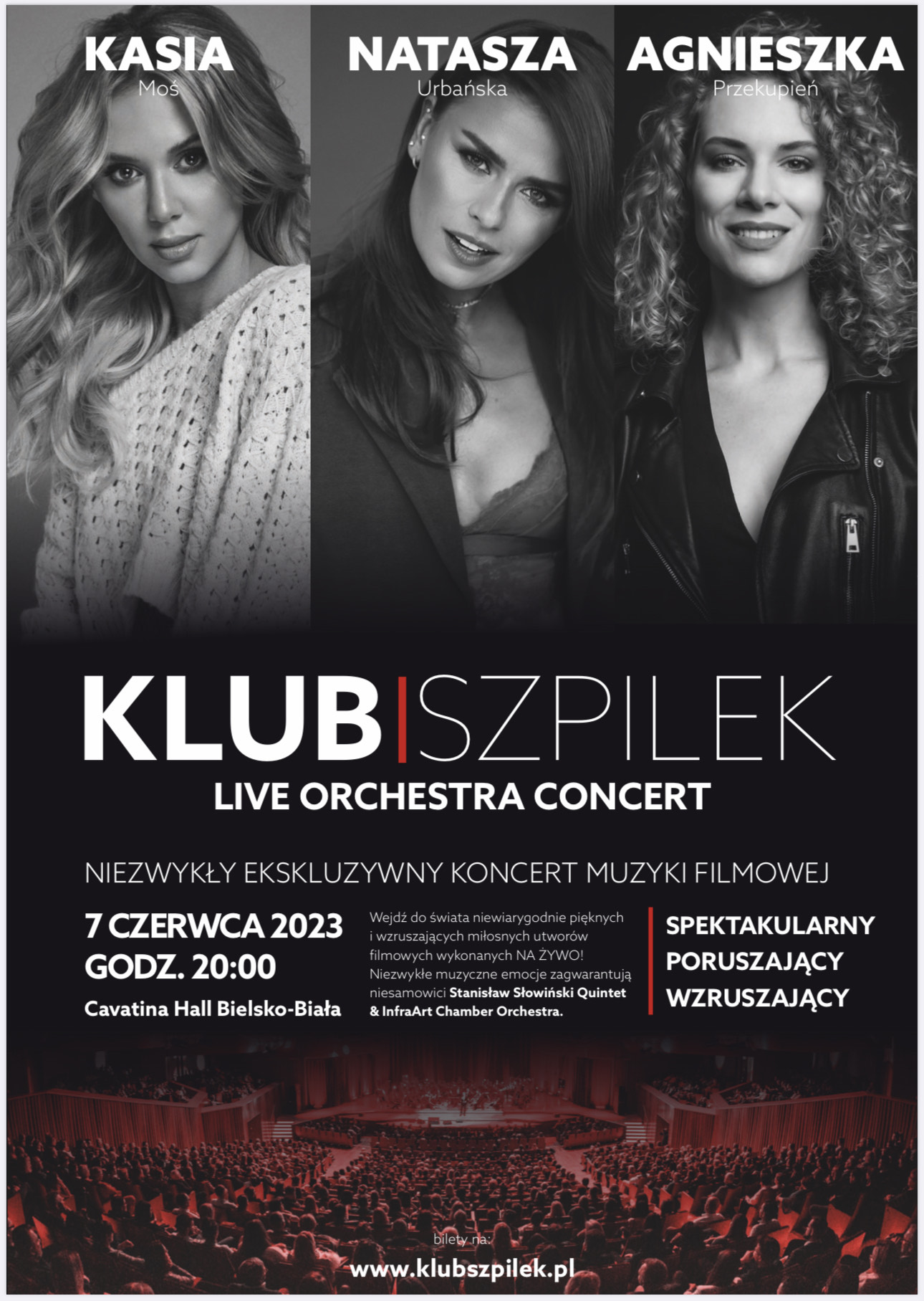 Klub Szpilek - Live Orchestra Concert powstał z pasji do muzyki i filmu, które wspólnie przenoszą nas w świat wzruszeń i wrażeń. Chcemy, by odbiorcy odnaleźli się w lubianych przebojach ze znanego filmowego repertuaru, a jednocześnie przeżyli coś nietypowego. Dlatego też zaprosiliśmy do tego projektu nie tylko cenioną Orkiestrę InfraArt ale także polskich solistów obdarzonych wyjątkowymi głosami w tym Nataszę Urbańską, Kasię Moś i Agnieszkę Przekupień. Ich współpraca zapewni wyjątkowe emocje, a widzowie przeżyją doświadczenie, które zostanie w ich pamięci na długo.