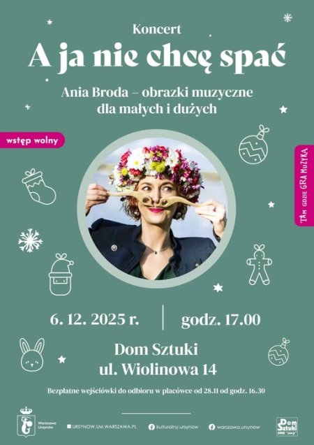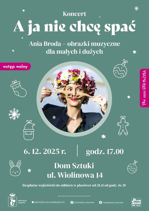 Koncert z cyklu „Tam Gdzie Gra Muzyka” zatytułowany „A ja nie chcę spać”. Wystąpi znakomita wokalistka, cymbalistka i kompozytorka Ania Broda wraz z zespołem. 🎶 „A ja nie chcę spać” to liryczny i pełen wyobraźni spektakl muzyczny dla dzieci i dorosłych, utkany z dźwięków głosu, fortepianu, wiolonczeli i instrumentów perkusyjnych. 📜 Koncert tworzy cykl muzycznych miniatur inspirowanych poezją Danuty Wawiłow, Doroty Gellner, Natalii Usenko, Teofila Lenartowicza, Włodzimierza Słobodnika i Witka Brody. Utwory opowiadają o dzikiej wróżce, czarnym lwie i gadającym parasolu – to muzyka do niespania, do marzeń i bujania w obłokach. 🎟️ Bezpłatne wejściówki na koncert można odbierać w Dom Sztuki od 𝙥𝙞𝙖̨𝙩𝙠𝙪, 𝟮𝟴 𝙡𝙞𝙨𝙩𝙤𝙥𝙖𝙙𝙖 od godz. 16:30. ❣️Zapraszamy!