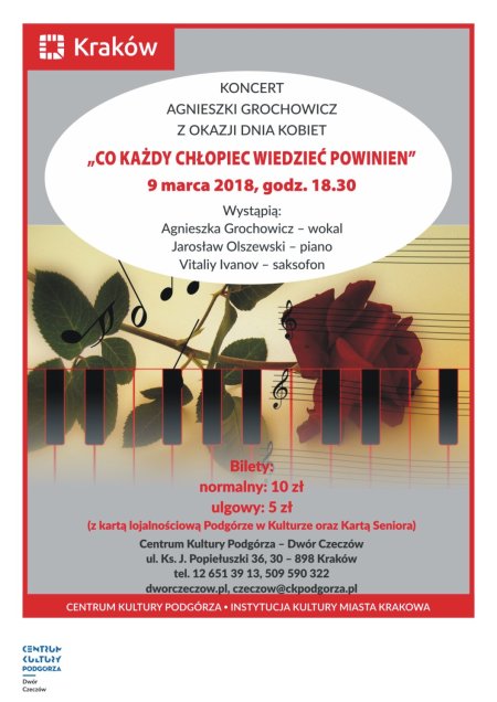 ZAPRASZAMY 9 MARCA GODZ. 18.30 NA KONCERT AGNIESZKI GROCHOWICZ Z OKAZJI DNIA KOBIET „CO KAŻDY CHŁOPIEC WIEDZIEĆ POWINIEN”. WYSTĄPIĄ: AGNIESZKA GROCHOWICZ – WOKAL, JAROSŁAW OLSZEWSKI – PIANO, VITALIY IVANOV – SAKSOFON.