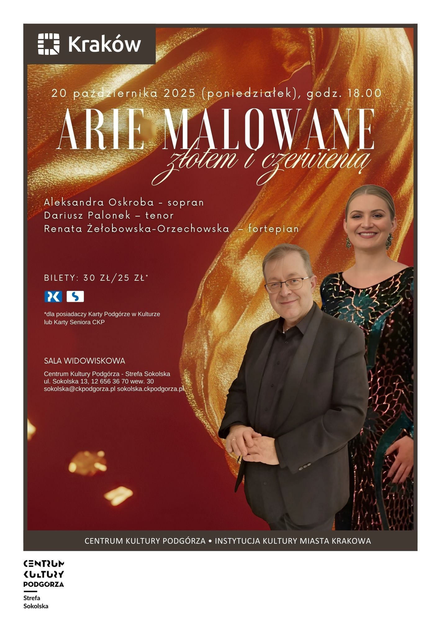 Zapraszamy na koncert pełen barw, w którym arie i duety operowe oraz operetkowe rozbłysną złotem i czerwienią. W programie znajdą się prawdziwe perły gatunku – Dziewczyno Ty moja, Piosenka o Wilji, Kto dał nam klucze do miłości bram – a także wiele innych melodii pochodzących z popularnych operetek.