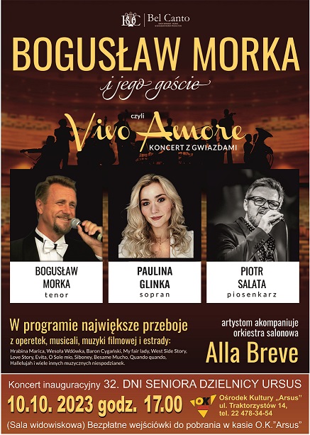 Koncert inauguracyjny 32. DNI SENIORA DZIELNICY URSUYS pt. „Bogusław Morka i jego goście czyli Vivo Amore” z udziałem Pauliny Glinki (sopran) i Piotra Salata (piosenkarz) przy akompaniamencie orkiestry salonowej Alla Breve. W programie największe przeboje operetkowe, musicalowe i filmowe.