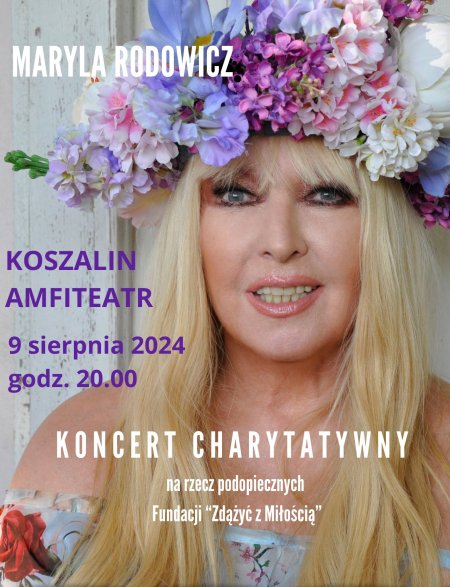 Fundacja "Zdążyć z Miłością” serdecznie zaprasza mieszkańców Koszalina, ale też wszystkich odwiedzających polskie wybrzeże na Koncert Charytatywny Maryli Rodowicz na rzecz podopiecznych Fundacji, w tym utworzenia Zakładu Aktywności dla 50 osób z niepełnosprawnościami oraz bezdomnych matek z dziećmi, organizowany w Amfiteatrze Koszalińskim w dniu 9 sierpnia 2024r. o godz.20.00. Bilety /cegiełki w cenie 50, 70, 90 lub 120 złotych .