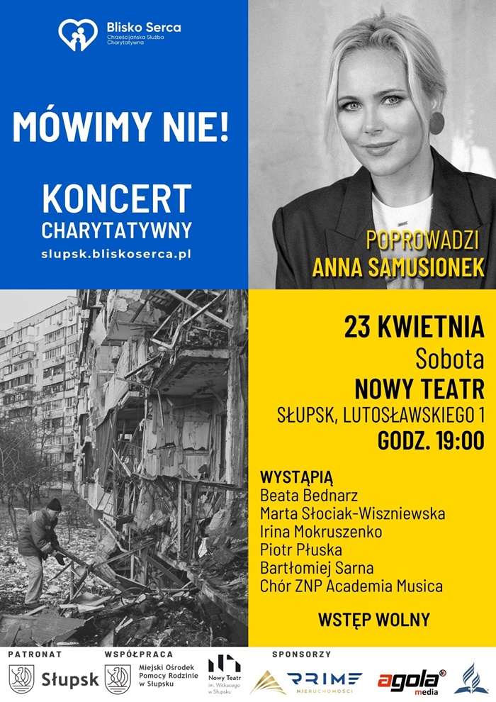 Podczas Koncertu zbierane będą pieniądze na pomoc uchodżcom wojennym z Ukrainy, którzy uciekli przed bestialstwem rosyjskich wojsk i schronili się w naszym mieście. Pomoc będzie koordynowana przez Miejski Ośrodek Pomocy Rodzinie w Słupsku.