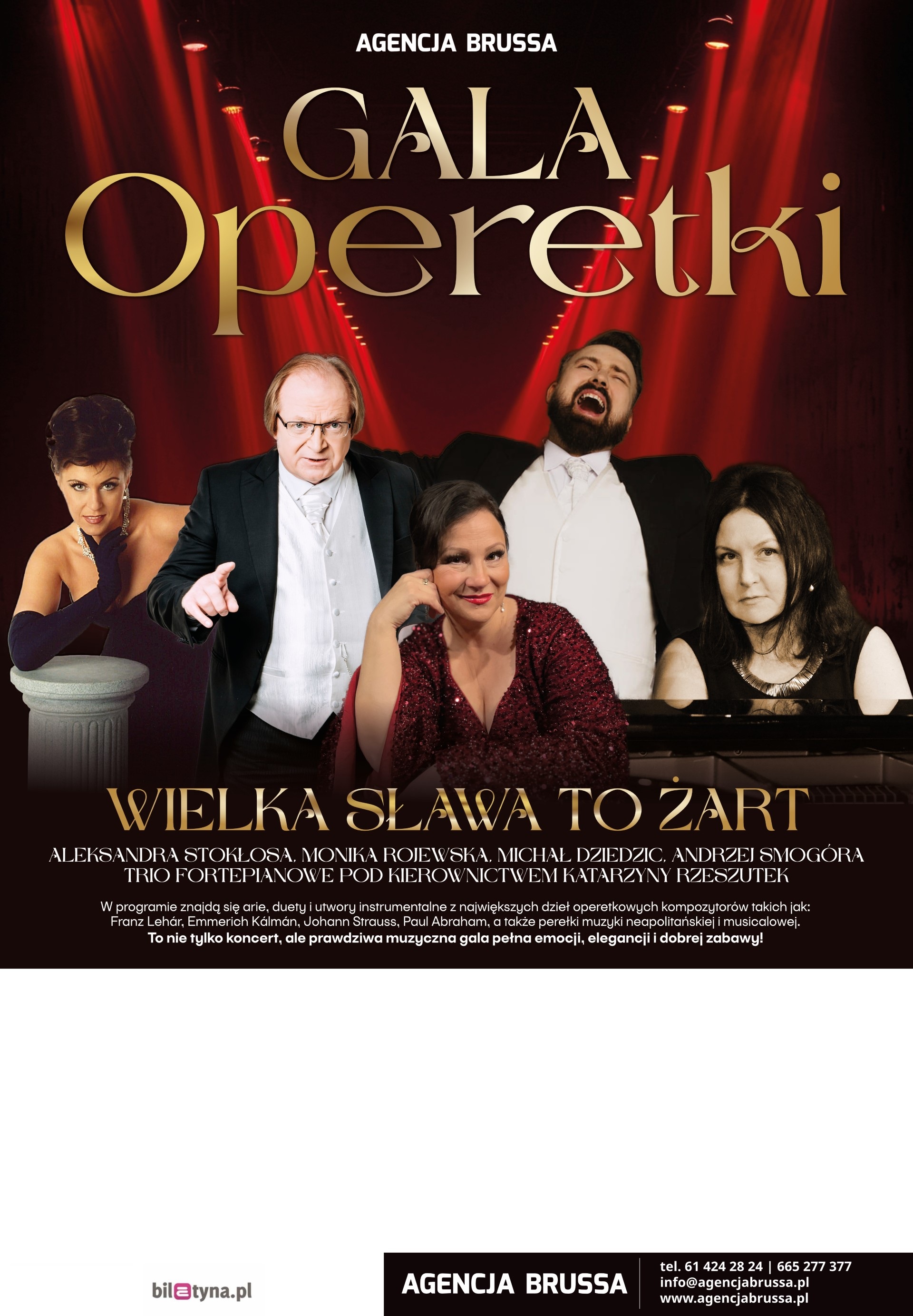 Wielkie przeboje operetkowe zabrzmią w mistrzowskim wykonaniu czołowych solistów sceny operetkowej – Aleksandry Stokłosy i Moniki Rajewskiej (soprany), Michała Dziedzica (tenor) oraz Andrzeja Smogóra (baryton i konferansjer). Towarzyszyć im będzie znakomite Trio fortepianowe pod kierownictwem Katarzyny Rzeszutek.