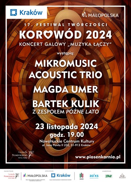 Fundacja PIOSENKARNIA Anny Treter już po raz 17-sty serwuje listopadową muzyczną ucztę podczas Festiwalu Twórczości Korowód w Krakowie. Wieczór pełen magii i dźwięków odbędzie się na scenie Nowohuckiego Centrum Kultury, gdzie spotkają się artystyczne dusze, by wspólnie celebrować potęgę muzyki. Wystąpi Natalia Grosiak z zespołem Mikromusic Acoustic Trio, znani z unikalnych aranżacji i emocjonalnych występów, niezrównana Magda Umer, której głos przeniesie nas w krainę lirycznych uniesień oraz Bartek Kulik z zespołem „Późne Lato“ - laureat konkursu „Piosenkarnia“ z 2023 roku, który zaskoczy nas świeżością i oryginalnością w utworach opowiadających historie pełne pasji i refleksji.