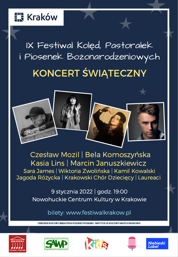 9 stycznia 2022 roku o godzinie 19:00 w Nowohuckim Centrum Kultury odbędzie się Koncert Finałowy IX edycji Festiwalu Kolęd, Pastorałek i Piosenek Bożonarodzeniowych. Usłyszymy: Czesława Mozila, Belę Komoszyńską (Sory Boys), Kasię Lins, Marcina Januszkiewicza oraz laureatów tegorocznej edycji Festiwalu wyłonionych w porannych przesłuchaniach konkursowych.